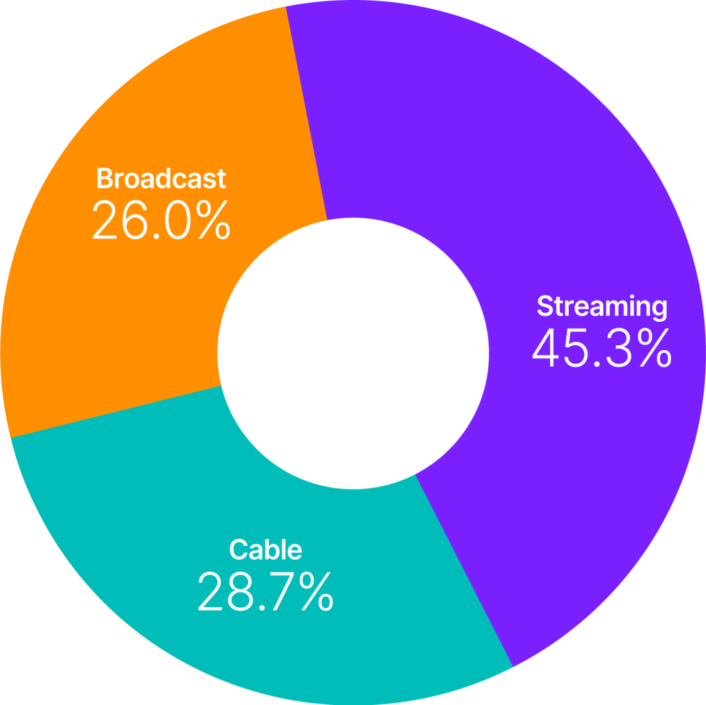 The data for The Gauge is derived from two separately weighted panels and combined to create the graphic. Nielsen’s streaming data is derived from a subset of Streaming Meter-enabled TV households within the National TV panel. The linear TV sources (broadcast and cable), as well as total usage are based on viewing from Nielsen’s overall TV panel.