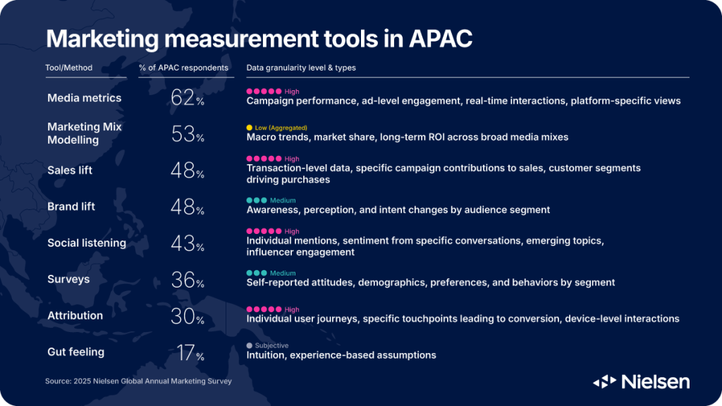 Complementing these broader assessments, APAC marketers also tap into more granular data for immediate insights. For a significant 62% of them, media metrics prove absolutely pivotal, providing that immediate pulse on campaign performance. Attribution models are leveraged by 30% to precisely understand the contributions of each touchpoint along the customer journey. And to fully round out these detailed insights, surveys prove essential for 36% of marketers, capturing nuanced customer perspectives often missed by purely quantitative data.