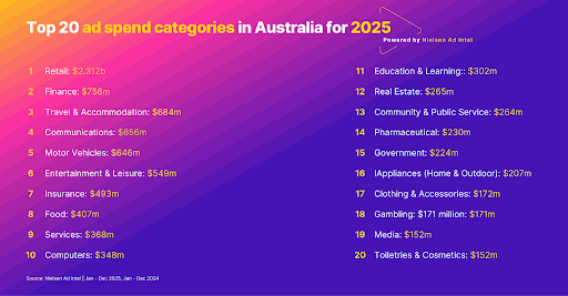 Retail remained the market’s dominant ad investor in 2025, attracting $2.312 billion, well ahead of every other category. Finance ranked second with $756 million, followed by Travel & Accommodation on $684 million, underscoring how fiercely brands competed in sectors tied to big household decisions and discretionary spending.