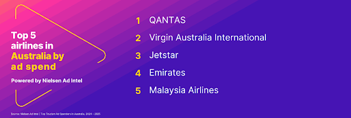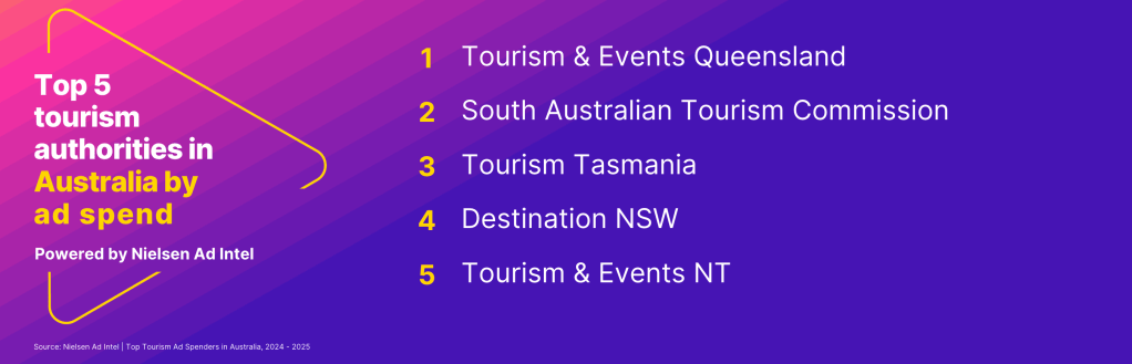 On the destination side, the top tourism advertisers were Tourism & Events Queensland, the South Australian Tourism Commission, Tourism Tasmania, Destination NSW and the Tourism & Events NT.