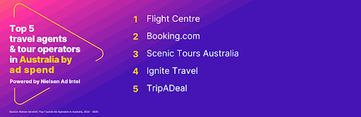 Among travel agents and tour operators, Flight Centre led the market for ad spend in 2025, followed by Booking.com, Scenic Tours Australia, Ignite Travel and TripADeal, according to Nielsen Ad Intel.
