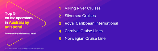 Cruise advertising also lifted, growing 9%, mirroring Australians’ growing interest in cruising, with 56% of potential travellers saying they would “consider taking a cruise”. Viking River Cruises topped the list of cruise ad spenders, followed by Silversea Cruises, Royal Caribbean International, Carnival Cruise Lines, and Norwegian Cruise Line.